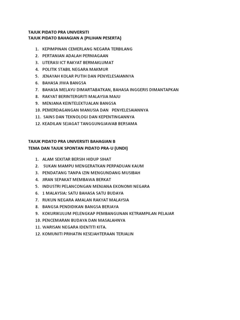 D) tajuk pidato yang disampaikan mestilah menepati tema yang telah pidato sekolah rendah. Pemidato akan menentukan sendiri tajuk pidato yang akan.